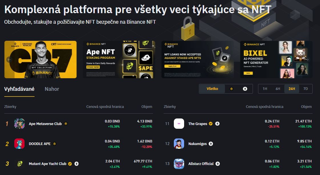 Sekcia NFT je trhovisko, kde si viete vybrať konkrétne NFT a nakupovať. Dozviete sa tu všetky informácie o dropoch, zbierkach a taktiež je tu možnosť NFT pôžičky a stakingu. Ak ste fanúšikom nezameniteľných tokenov, neváhajte a preskúmajte túto platformu.
