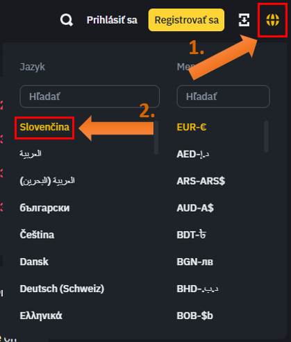V prvom rade, ak chcete využívať produkty najpopulárnejšej kryptomenovej burzy Binance, musíte si vytvoriť účet. Registrácia je jednoduchá a vyžaduje štandardné kroky. Najprv odporúčame vpravo hore na domovskej stránke binance.com zmeniť jazyk na slovenský, aby ste sa lepšie orientovali.