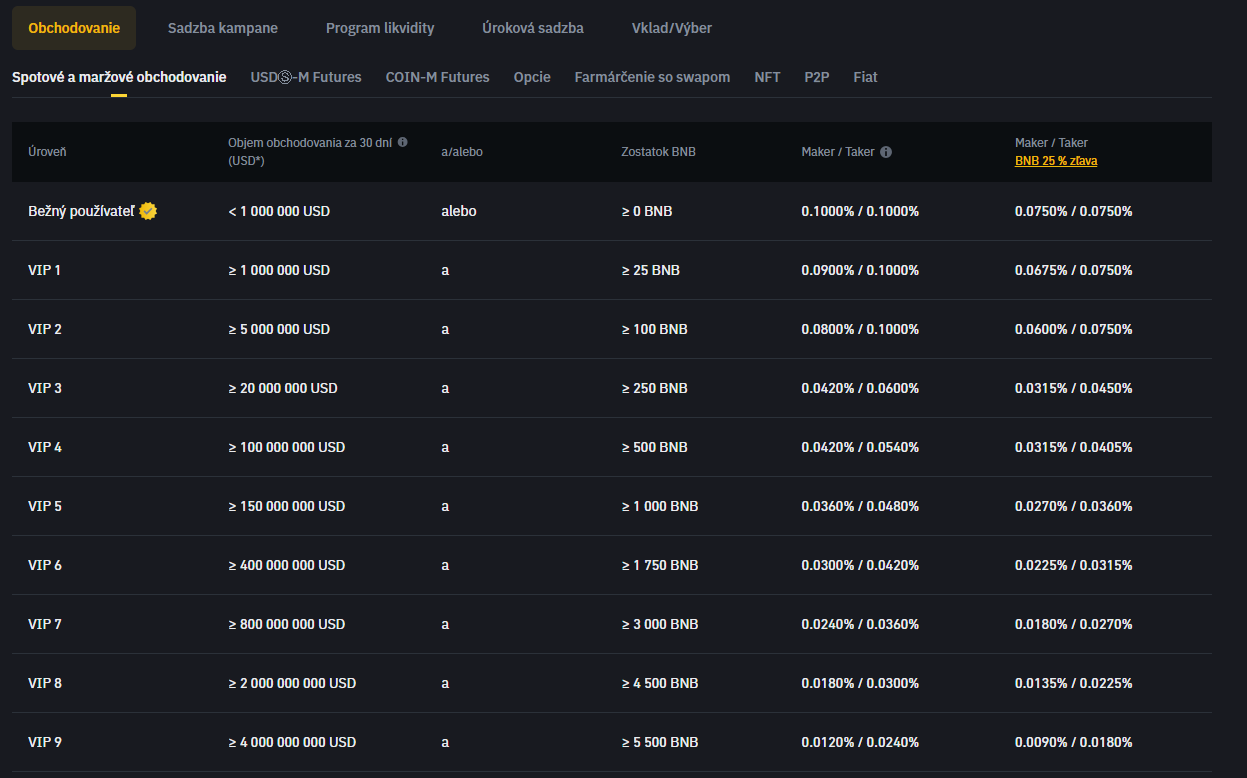 Poplatky a výhody VIP získané z akéhokoľvek VIP programu platia univerzálne pre všetky produkty Binance. Objem obchodovania zahŕňa všetky objemy na spote, marži a z obchodných botov. V tejto sekcii nájdete aj rovnaký zoznam poplatkov podľa VIP úrovní pri produktoch ako futures, opciách, NFT a podobne.
