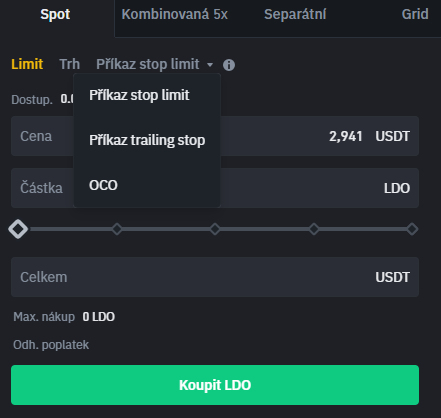 - Trh – najjednoduchší príkaz, ktorým zobchodujete kryptomenu za aktuálnu (spotovú) cenu.