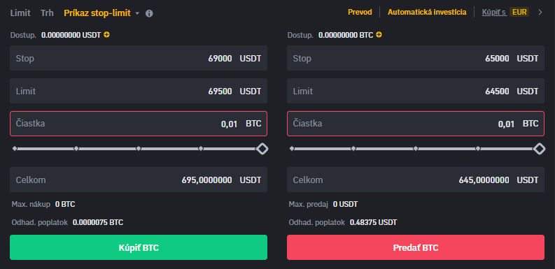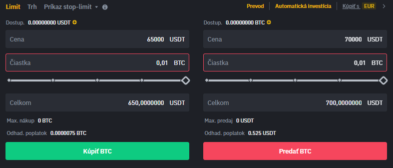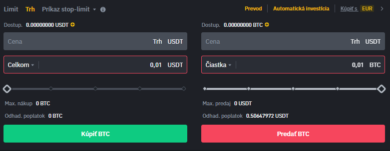 - Čiastka: nakupujeme BTC za 0,01 USDT resp. predávame 0,01 BTC.