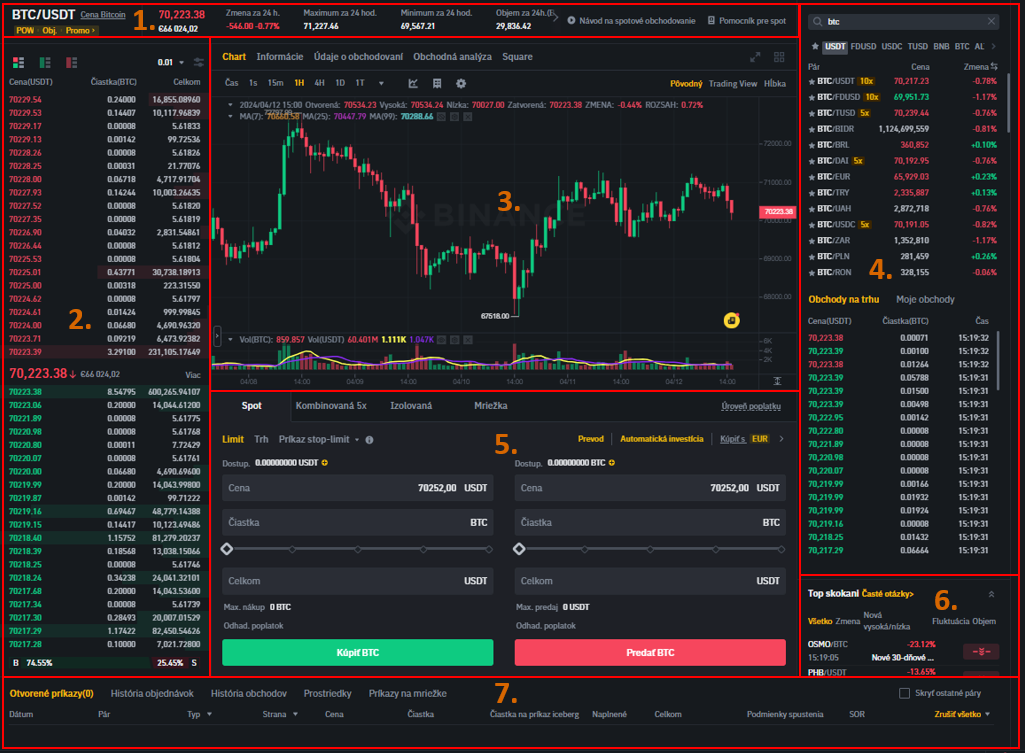 Na obrázku nižšie už môžete vidieť rozdelenie obchodného rozhrania na 7 základných sekcií, medzi ktoré patrí: