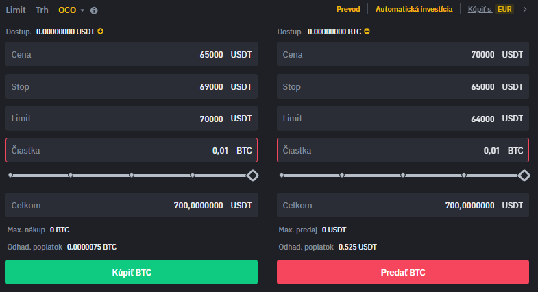 Vďaka OCO (One cancels other) môzete v jednom príkaze zadať limitnú a stop limit objednávku. Ak sa zrealizuje jedna z týchto objednávok, druhá sa automaticky zruší a OCO príkaz zanikne. Obidva príkazy musia byť buď na nákup alebo predaj.