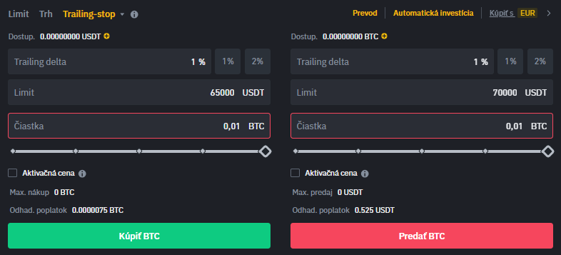 - Trailing delta: v oboch prípadoch sme zadali 1 %. Trailing delta (posuvná cena) je percento pohybu v opačnom smere, ktoré ste ochotní tolerovať. Hodnota trailing delta sa pohybuje od 0,1 % do 20 %.
