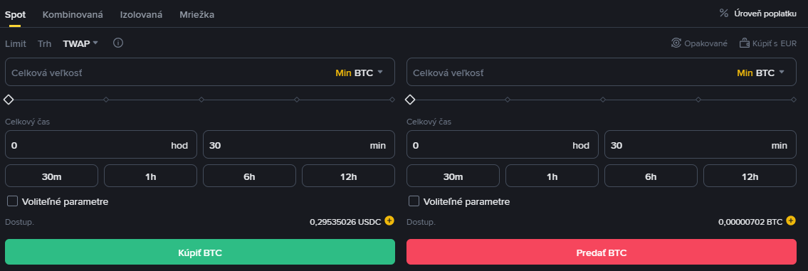 TWAP sa využíva vtedy, ak veľkosť vašej objednávky presiahne likviditu dostupnú v knihe čakajúcich objednávok. Na Binance tento príkaz umožňuje nastavenie časového rozsahu od minút až po hodiny. Počas tejto vami zadanej doby bude algoritmus zadávať objednávky v pravidelných intervaloch.
