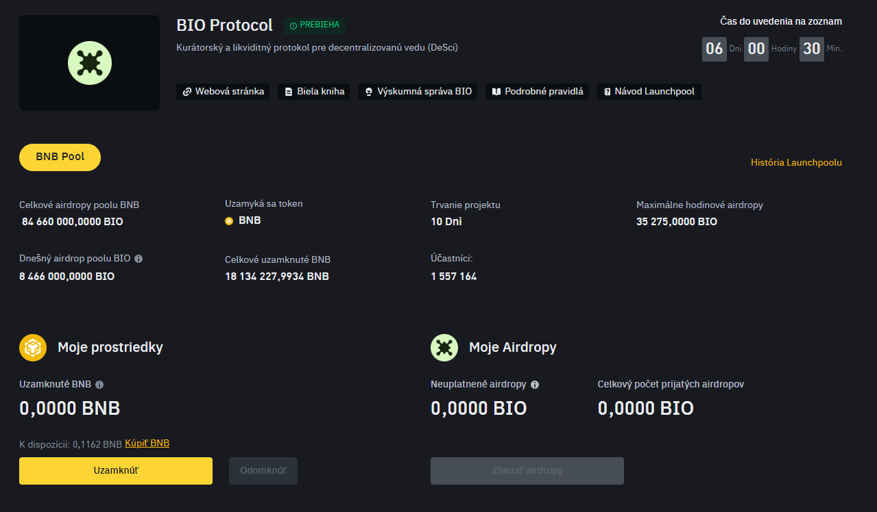 Binance Launchpool je skvelý spôsob, ako podporiť inovácie v kryptosvete a zároveň profitovať z držania vašich aktív. Staking viete kedykoľvek zrušiť a navyše zarábate nové tokeny BIO, ktoré po zalistovaní môžu vytvoriť masívne zhodnotenie.