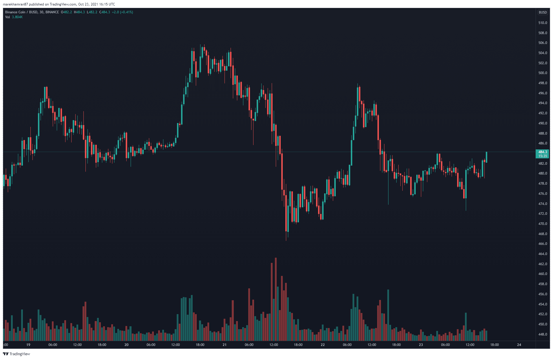 V čase písania tohto článku sa cena Binance Coinu pohybovala na úrovni 483,3 USD. BNB sa stále drží v TOP 3 najväčších kryptomien podľa trhovej kapitalizácie. Na chrbát mu však dýcha Cardano a Tether.