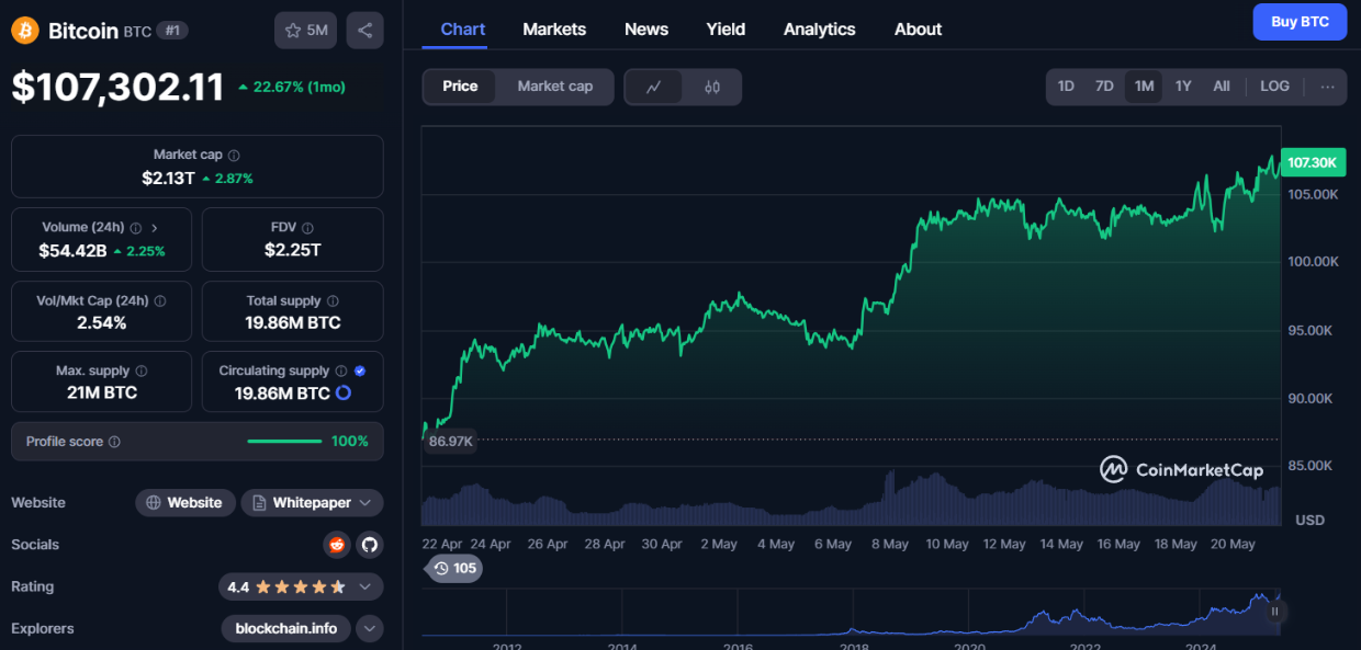 Cena Bitcoinu vzrástla za posledný mesiac o viac ako 22 % a najväčšia kryptomena sa v čase písania tohto článku obchoduje za 107 300 dolárov. Mnohí investori a analytici očakávajú, že Bitcoin v nasledujúcich dňoch prekoná svoje historické maximum 109 144,88 dolárov z 20. januára 2025. V tomto článku sa dozviete, čo stojí za aktuálnym rastom ceny BTC a ako môžete využiť tento rast vo svoj prospech.
