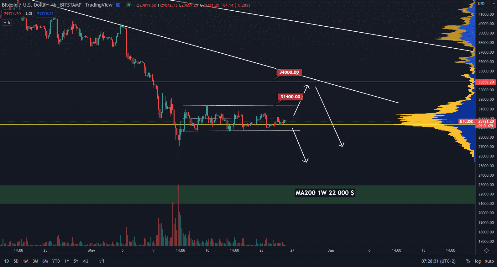Bitcoin za posledný deň nevytvoril signál prerazenia sideway štruktúry a cena tak pokračuje v úzkom intervale rezistencie a supportu okolo 30 000 $. Tento bočný pohyb je aktuálny už dva týždne a každú chvíľu sa môže ukončiť. My sa teda pozrieme na scenáre, ktoré sledujem v prípade, že cena tento pohyb ukončí.