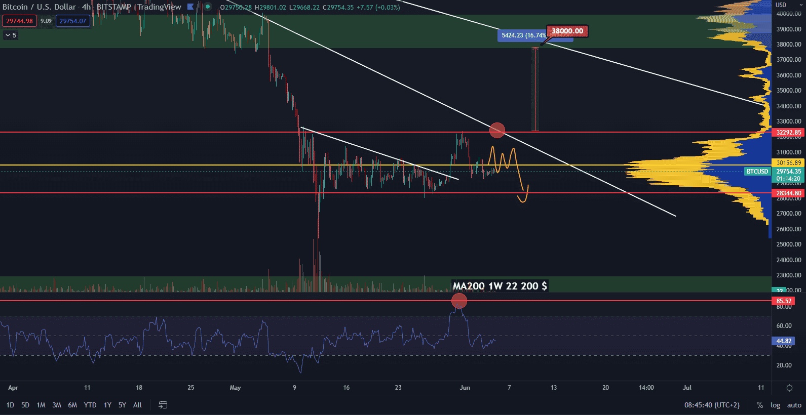 Poďme sa pozrieť na býčí setup Bitcoinu. Ak cena dokáže prekonať hladinu 32 300 $ a uzavrie na dennej sviečke close cenu nad touto hladinou, tak je možné, že cena hlavnej kryptomeny porastie o vyše 10 %. Prerazenie rezistencie navyše musí byť sprevádzané vysokými objemami. Zatiaľ sa tak nedeje, ale tento scenár je potrebné sledovať s potenciálnym targetom až 38 000 $.