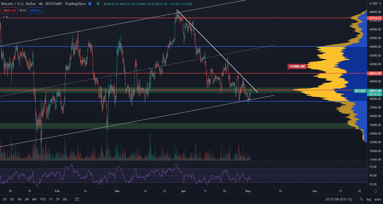 Úzke pásmo nasvedčuje tomu, že každú chvíľu sa rozhodne o pokračovaní Bitcoinu. Očakávať môžeme z krátkodobého hľadiska zvýšenú volatilitu, keďže cena prekoná jednu z dôležitých hladín. Trhová cena sa momentálne nachádza na point of control cca 39 000 $ a stále teda udržuje supportnú úroveň vlajky.