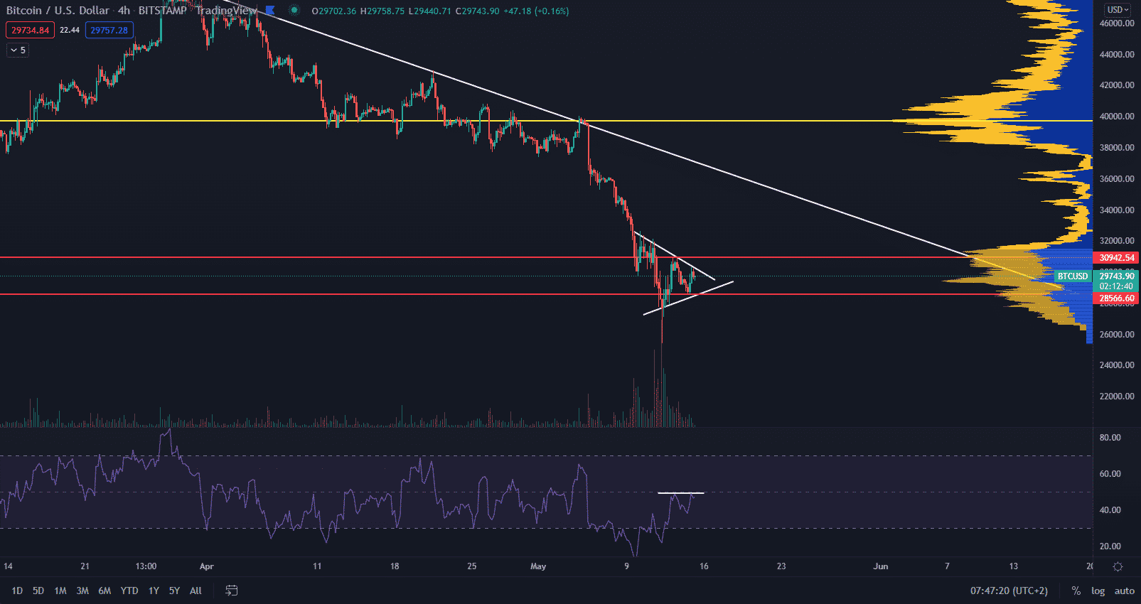 RSI z krátkodobého hľadiska dosiahlo dve posledné maximá na rovnakej hladine. Cena však dosiahla klesajúce maximá. Trend upadá, a preto je obchodovanie trojuholníka riskantné. Ak cena prekoná 30 950 $, tak môžem targetovať 32 700 $. Signál však stále nenastal.
