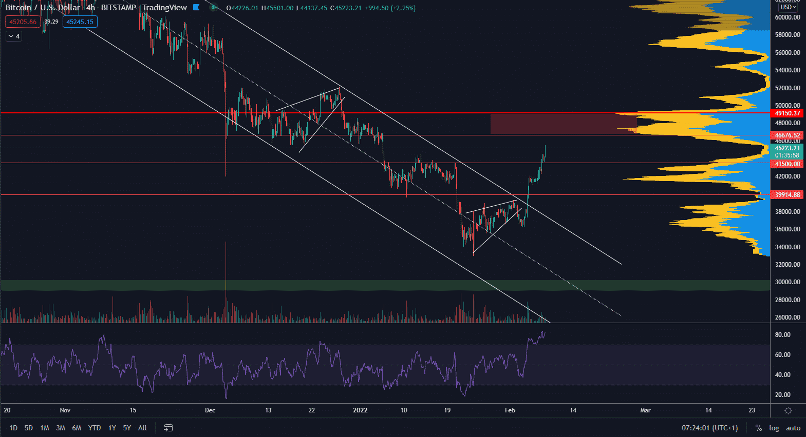 BTC smeruje do silnej rezistentnej zóny zhruba 46 500 $ až 49 000 $. Je dosť pravdepodobné, že práve v tejto zóne sa vytvorí lokálne maximum v rámci rastúceho trendu. Objemy v súčasnom raste taktiež ustupujú, čo tiež značí blížiace sa lokálne maximum. Nejde však o jediný indikátor.