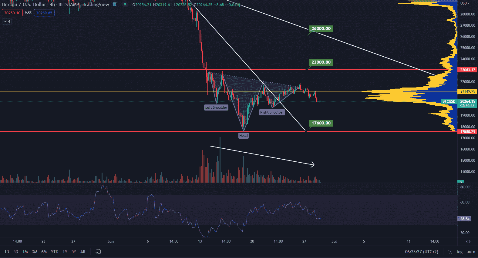 Najbližšiu rezistenciu sledujeme na hladine 23 000 $ a support na 17 600 $. Pokým cena neprekoná jednu z týchto hladín, tak sme sideway. Je potrebné brať na vedomie, že hladina 17 600 $ nemusí byť absolútnym dnom dlhodobej korekcie a cena môže ešte spadnúť.
