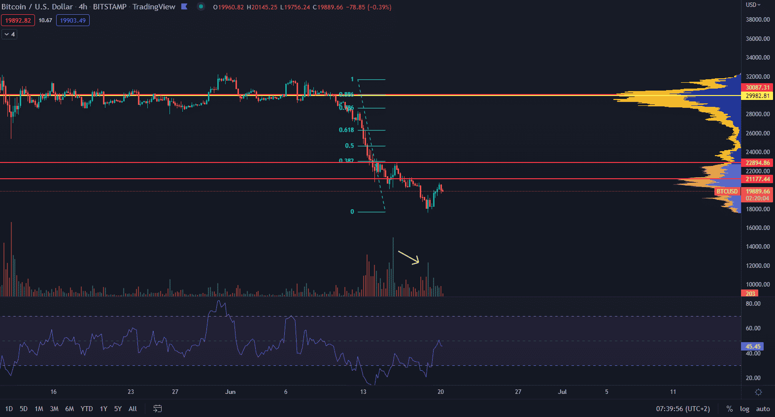 V prípade bearish scenára sledujeme okrem súčasného supportu 19 000 $ aj hladinu 12 000 $. Práve tam sa začínajú vyskytovať vysoké transakčné objemy, ktoré sú aj 20X vyššie ako sa v priemere vyskytovali za posledné 2 roky. Aktuálne je to najviac bearish scenár, ktorý môžeme na grafe identifikovať.