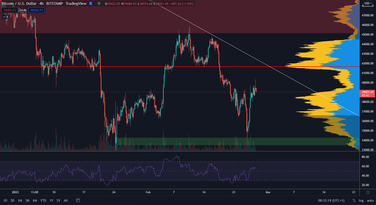Cena sa krátkodobo dostala nad 40 000 $ a v čase písania článku sa obchoduje za 39 000 $. Najbližšia rezistencia a zároveň point of control sa nachádza na zóne okolo 42 000 $. Okrem toho sa tu nachádza aj rezistencia z maxím korekcie. Je pravdepodobné, že cena sa s touto zónou nevyrovná okamžite.