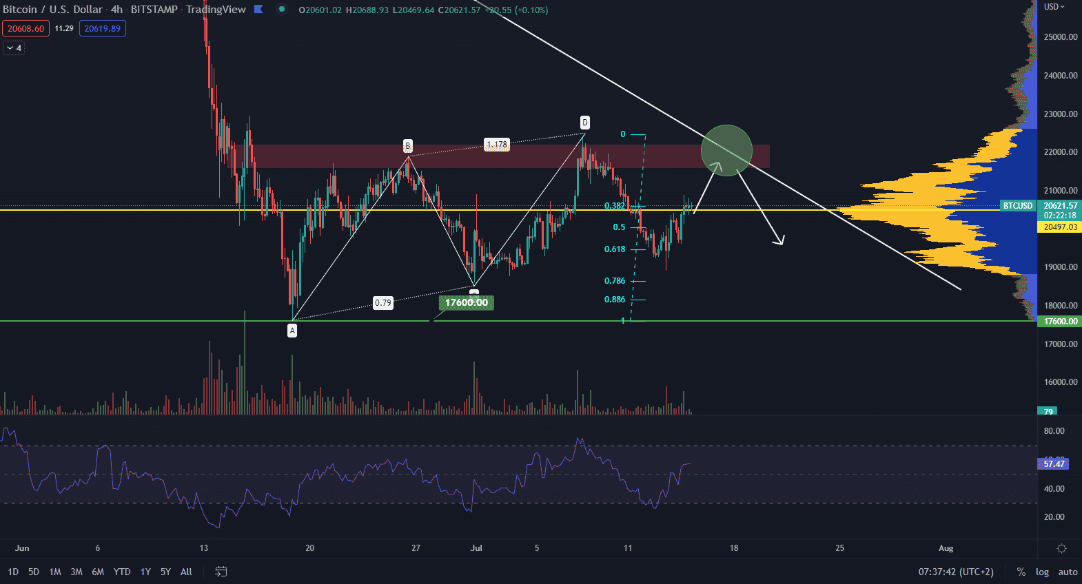 Trhová cena má priestor dosiahnuť 22 000 $ v súčasnom trende. Táto zóna predstavuje rezistenciu aktuálnej sideway štruktúry. Navyše sa tu vyskytuje aj klesajúca rezistencia vytvorená z dlhodobých klesajúcich maxím korekcie. Vzniká tak pomerne silná zóna odporu, na ktorej prerazenie zatiaľ chýbajú objemy.