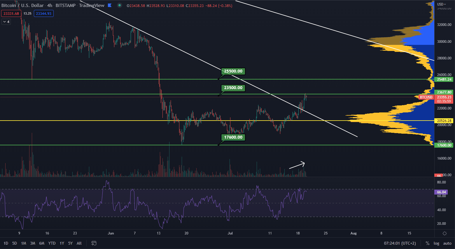 Na grafe nižšie vidíme, že rastúci trend ešte neskončil a sledujeme ďalší target na hladine 25 500 dolárov. Pozitívom sú aj narastajúce bullish objemy, ktoré sprevádzajú rastúci trend. Čo však, naopak, nie je pozitívom, je ich veľkosť objemov. Napriek tomu, že rastú, nemôžeme ich považovať za významné.