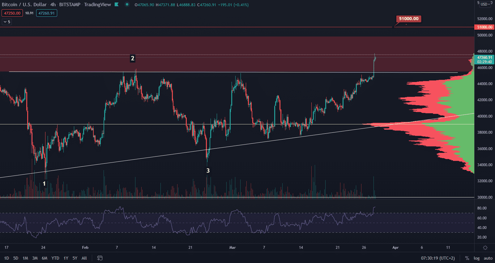 Bitcoin nakoniec po viac ako dvoch mesiacoch ukončil ascending triangel a prerazil rezistenciu 46 000 $. V čase písania sa cena obchoduje na úrovni 47 200 $. Teraz je ďalším krokom určiť, kam až bude súčasný rastúci trend pokračovať a vysvetliť si, čo vlastne tento preraz znamená. Potvrdilo sa totižto prvé rastúce maximum od ATH.