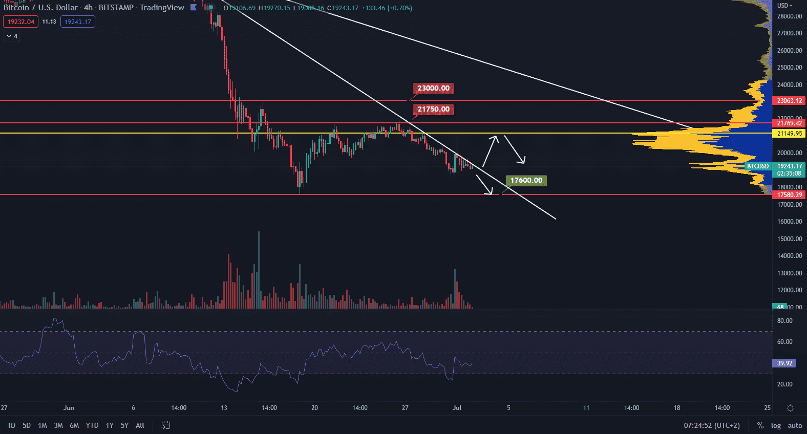 Je možné, že cena formuje krátkodobé lokálne dno, čo potvrdilo aj RSI prekonaním hladiny prepredanosti smerom nahor. Bullish target sa nachádza na hladine point of control 21 170 $. Zatiaľ predikujeme iba pokračovanie sideway štruktúry, pretože objemy chýbajú a posledný pokus nakupujúcich bol zamietnutý.