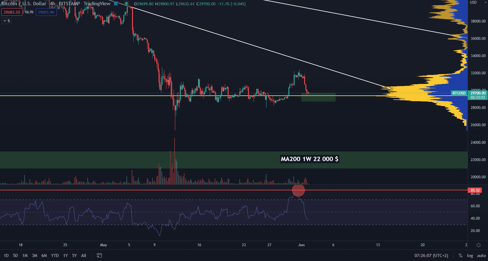 Dlhodobý support, ktorý sledujem, je na týždennom MA200. Ten predstavuje hodnotu okolo 22 000 $ a v čase rastie. V minulosti predstavoval absolútne dná korekcií. Krátkodobo však cena môže spadnúť aj pod tento indikátor.