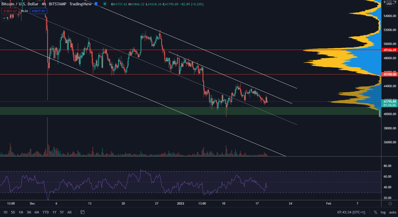 Bitcoin z krátkodobého hľadiska mierne pokračuje v klesajúcom legu, no cena viac-menej stagnuje tesne nad kľúčovým supportom 40 000 $. Zatiaľ sa jej darí ho udržať. Napriek tomu cena dosahuje dlhodobo klesajúce minimá aj dlhodobo klesajúce maximá. Z pohľadu trendov sa tak zdá, že korekcia stále neskončila.