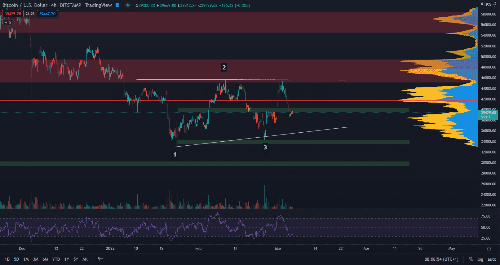 Ak cena bude pokračovať v korekčnom legu, najbližší support sa nachádza na hladine 37 000 $ a 33 000 $. Cena by mala dosiahnuť vyššie lokálne minimum ako v bode 3 na hladine 33 000 $. Ak cena neudrží toto minimum, tak je možný scenár, že zaútočí na hranicu 30 000 $.