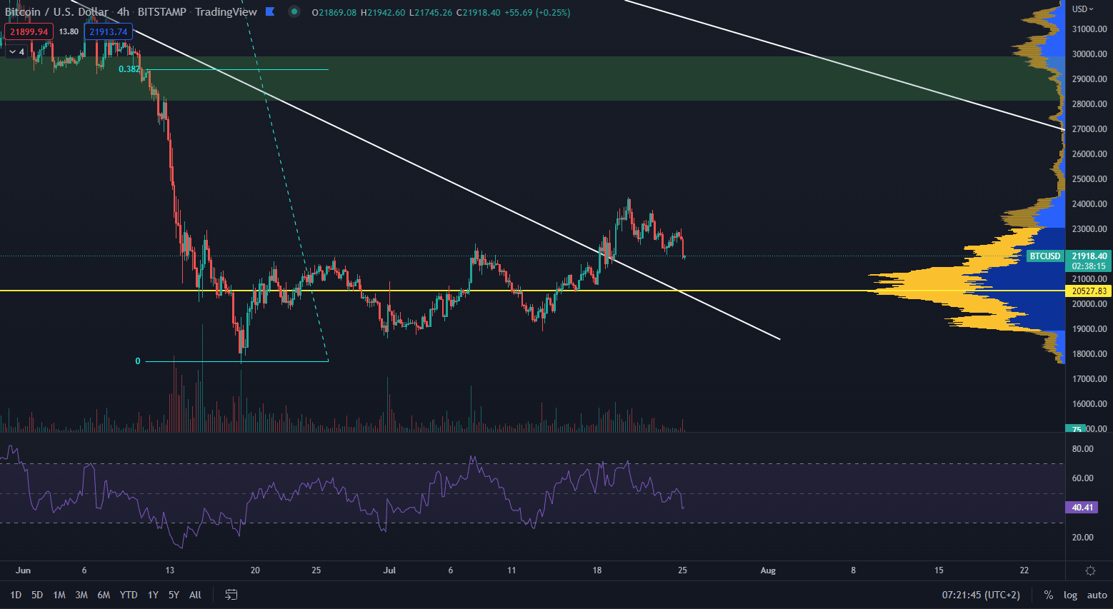 Trhová cena sa nachádza v čase písania analýzy na hladine 21 840 dolárov a pokračuje v páde. Objemy predávajúcich sa dokonca z krátkodobého hľadiska navýšili, čo znamená, že prepad môže pokračovať. Najbližší target a zároveň aj support budem sledovať na zóne okolo point of control 20 500 dolárov.