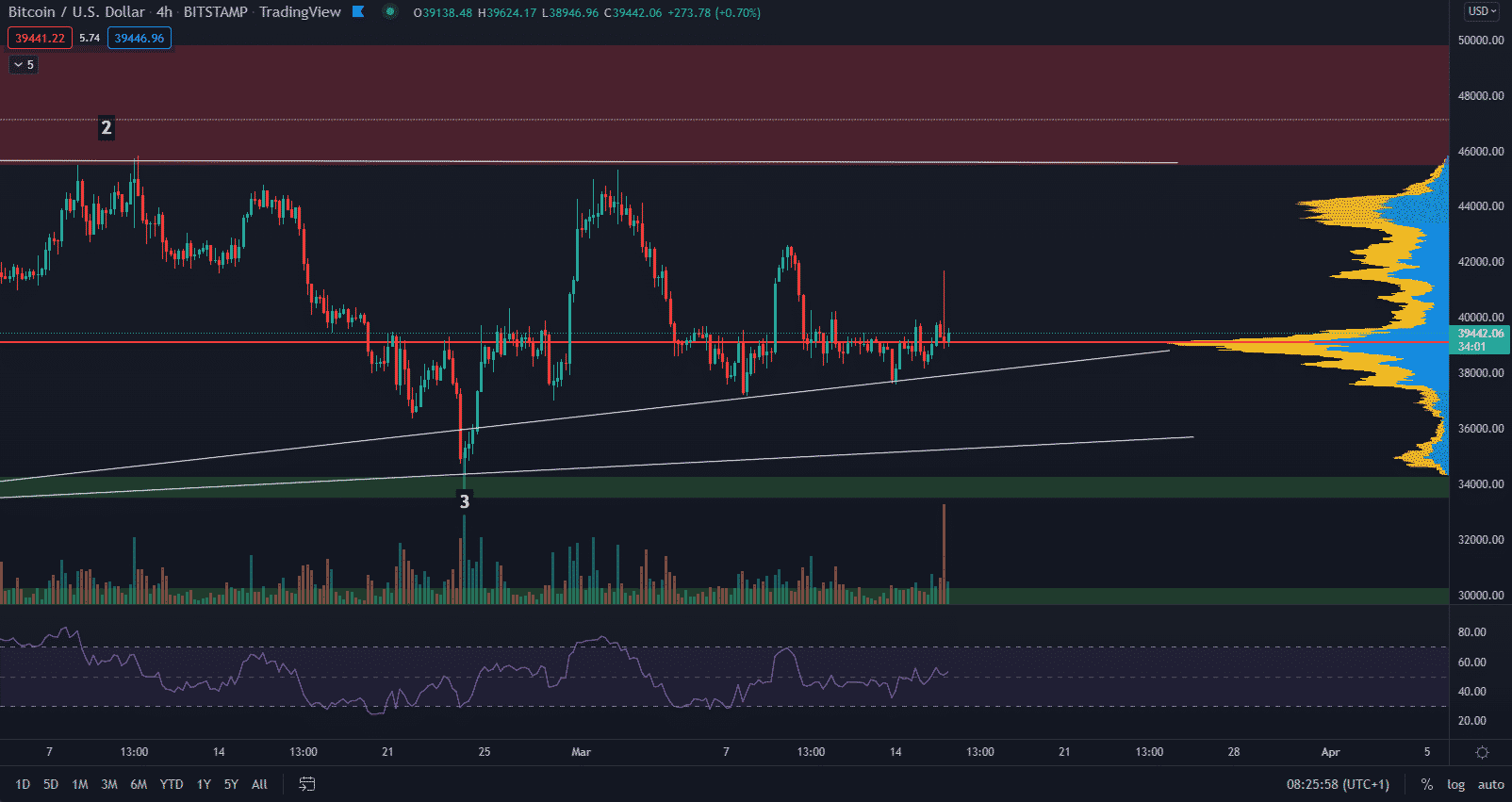 Ak cena prekoná rezistenciu 46 000 $, bude potvrdený rastúci trend. Ale čo ak cena neudrží support? V tom prípade je potrebné nájsť zóny dokupovania. Prvou zásadnou zónou na dokupovanie je hladina okolo 30 000 $. V zásade všetky ceny pod 30 000 $ môžu byť agresívne skupované. Graf ostáva dlhodobo bullish.