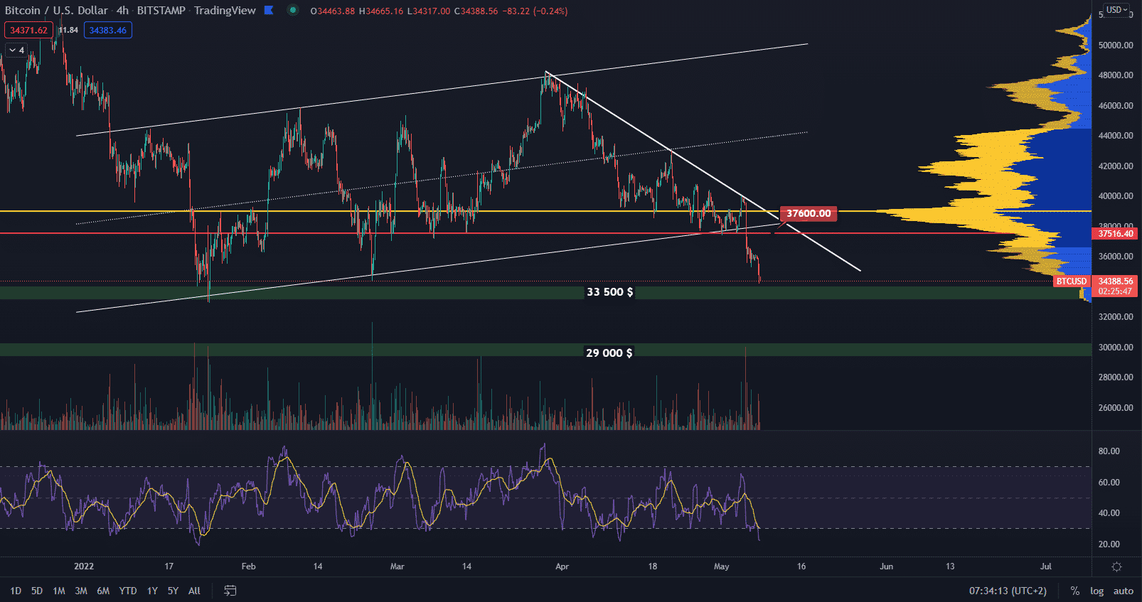 Support budeme sledovať na hladine 33 500 $, kde sa môže sformovať práve spomínané minimum. Z dlhodobejšieho hľadiska nás bude určite zaujímať support na hladine cca 30 000 $, čo je zároveň spodná hranica flatovej štruktúry, ktorá je aktuálna od januára 2021. Tento prepad však nemusí byť až taký negatívny.