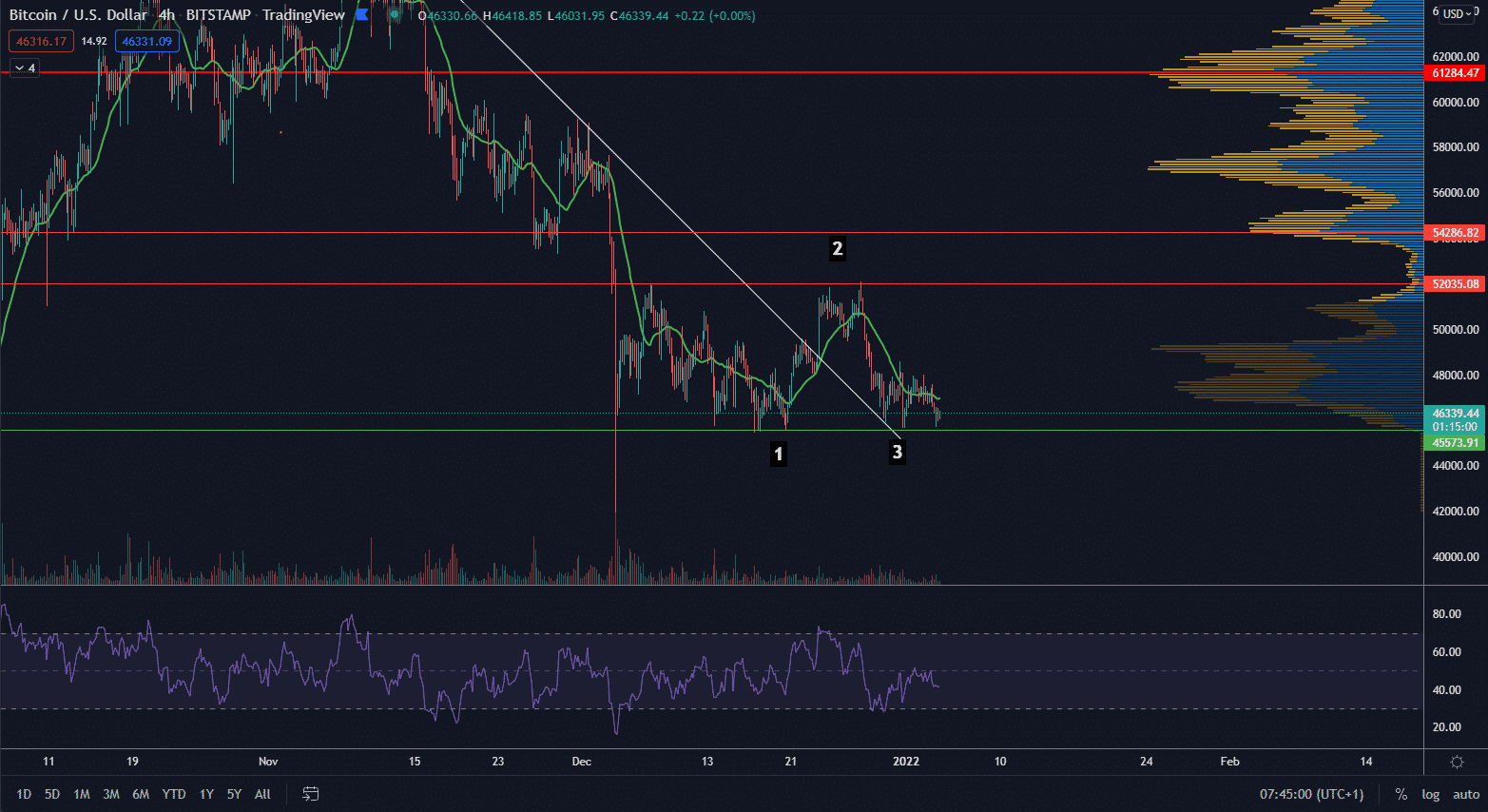 Potenciálne 123 bottom formation stále nie je potvrdené a práve naopak, je dosť možné, že bude porušené. Cena sa totiž nachádza tesne pri bode 3 a 1, čo predstavuje mesačný support súčasnej štruktúry. Ak cena spadne pod tento support, najbližšia hodnota, ktorú budeme považovať za supportnú, je v intervale 41 000 $ až 43 000 $.