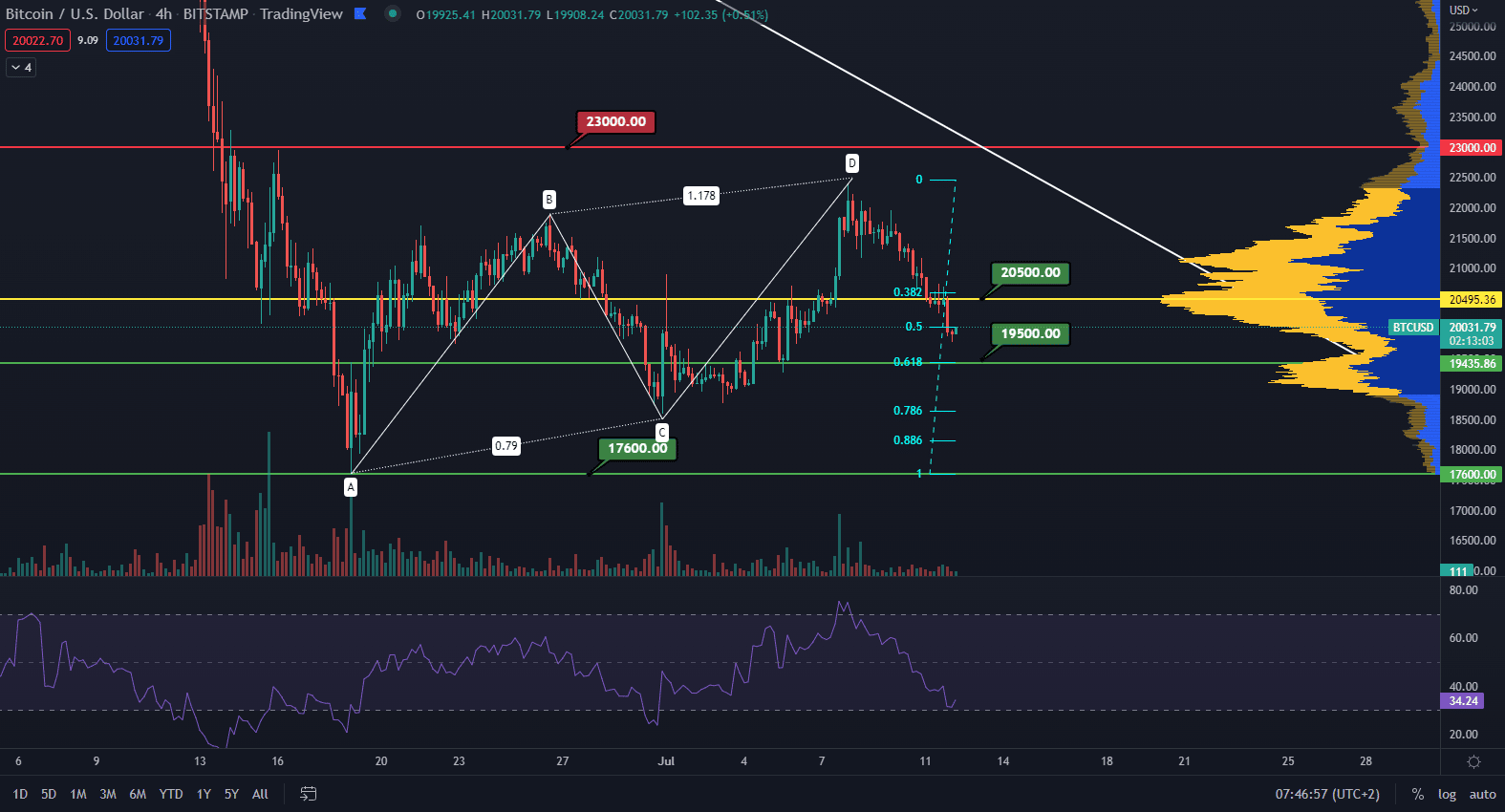 Bitcoin sa aktuálne nachádza na hladine 20 000 $ a zdá sa, že táto oblasť by mohla slúžiť ako support. Konkrétne ide o retracement 50 % z harmonického patternu AB = CD. Stále sa však nachádzame v nadradenej mesačnej sideway štruktúre, ktorá je ohraničená supportom 17 600 $ a rezistenciou 23 000 $.