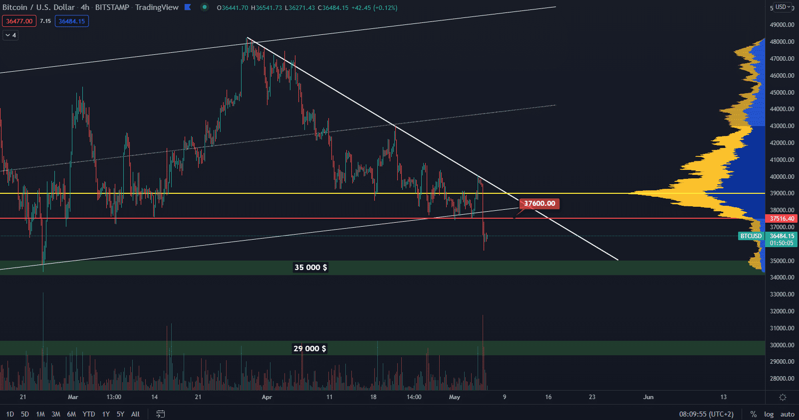 Zatiaľ teda budeme sledovať iba support 35 000 $. Samozrejme, dlhodobo významnou hladinou je aj supportná zóna 29 000 $ až 30 000 $. Je možný aj tento scenár, ale pre účely krátkodobej analýzy to zatiaľ riešiť netreba. Ak chceme rozmýšľať nad reverziou trendu potrebujeme preraziť rezistenciu z maxím korekčného legu.