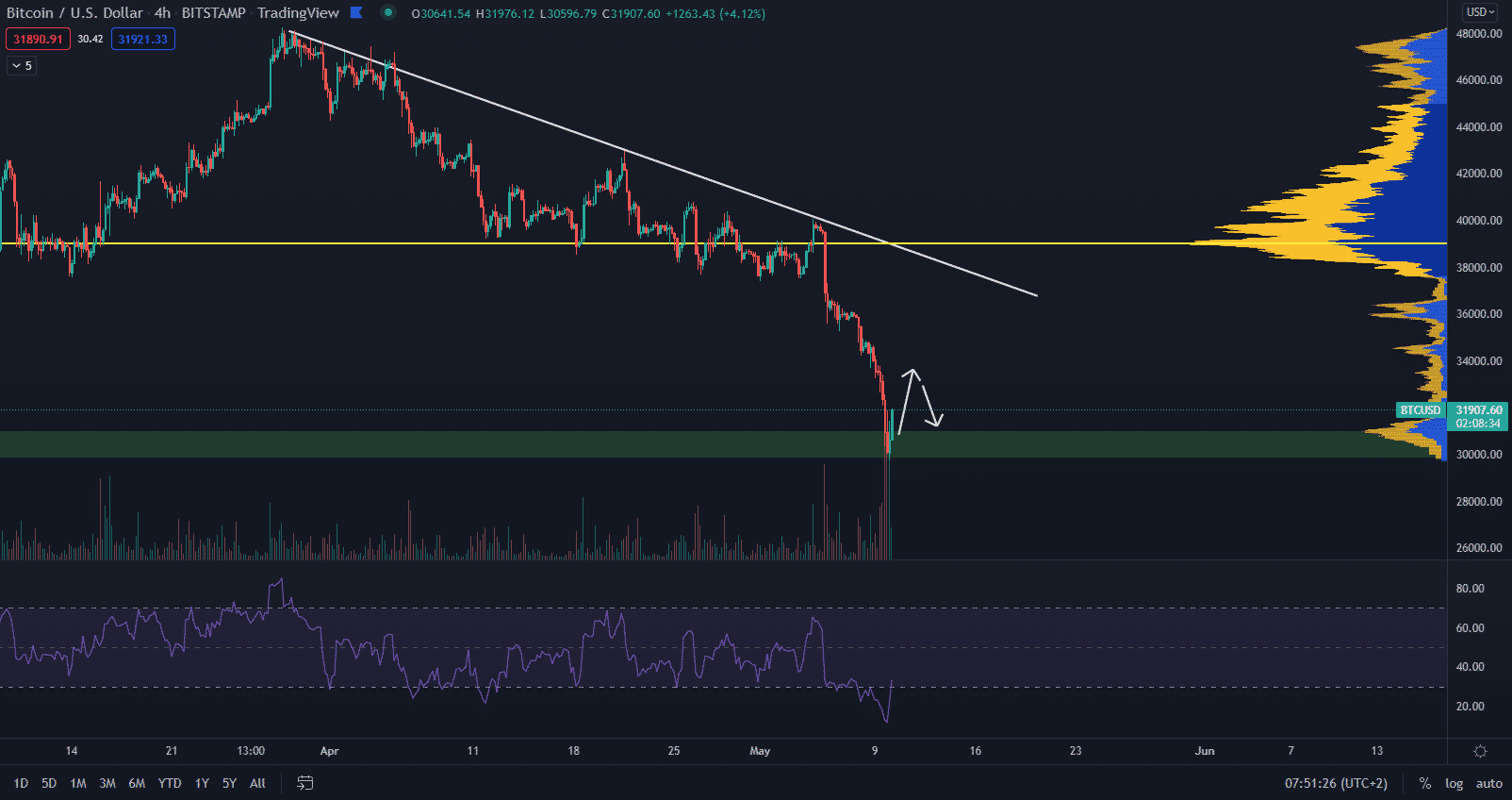 Bitcoin narazil na dno 30 000 $ a dosiahol tak prepad 25 % len za 5 dní. Takáto korekcia tu nebola dlhší čas, no na druhej strane bola očakávaná. Zdá sa, že cena vytvára lokálne minimum, no pravdepodobne iba v rámci korekčnej štruktúry. Support zatiaľ drží a len čas ukáže, či ho cena dokáže rešpektovať.