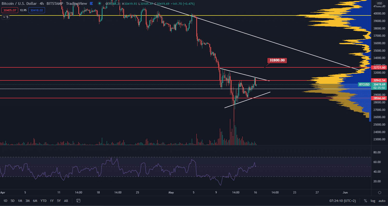 Bitcoin pokračuje v miernom raste a a dosiahol lokálne maximum z krátkodobého hľadiska na hodnote 31 400 $. Objemy však ustupujú a preto je v hre pokračovanie korekcie. Napriek tomu nás bude zaujímať pozícia ďalšieho lokálneho minima, ktoré môže byť smerodajné pre budúci krátkodobý trend.
