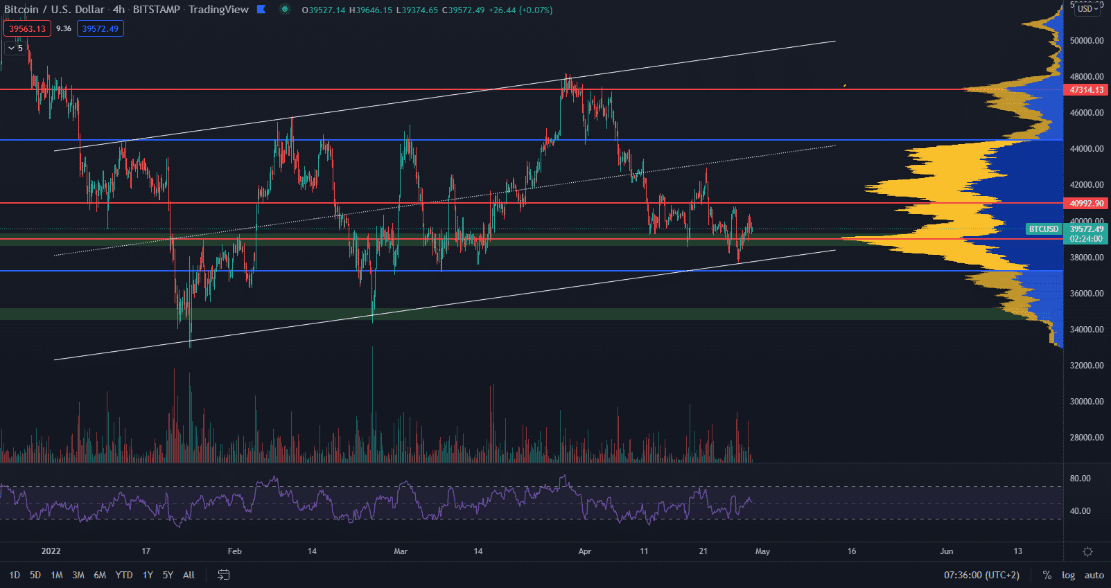 Hlavná kryptomena stále dosahuje krátkodobé klesajúce minimá aj maximá. Tempo klesajúceho trendu ustupuje a nachádzame sa priamo na supportnej zóne. Ak cena čoskoro nevytvorí reverziu, ideálne za podpory objemov, tak sa prepadne pod tento support. Reverzia však nastane, až keď cena prekoná posledné maximum na hladine 41 000 $.