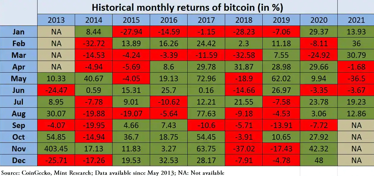 Podľa dát od Coingecko a Mint Research je najhorší mesiac pre Bitcoin práve september. Počas obdobia od roku 2013 až 2020 iba 2 roky Bitcoin tento mesiac rástol. Preto sa treba pripraviť v nasledujúcej dobe skôr na pokles, než na väčší bullish pohyb.