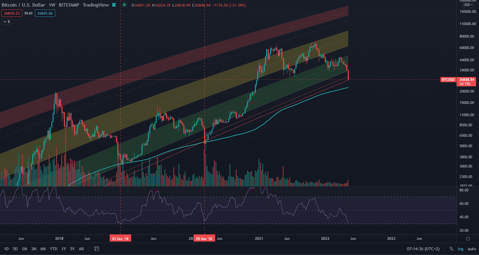Bitcoin nedávno zlyhal na supporte 30 000 $ a neudržal ho. Prepad pokračuje a súčasná týždenná sviečka je dokonca zatiaľ najviac volatilná spomedzi sviečok súčasnej korekcie. Tento prepad je kľúčový a hovorí o tom, kde sa cena nachádza. Sme totižto v podhodnotenej fáze na logaritmickom grafe.