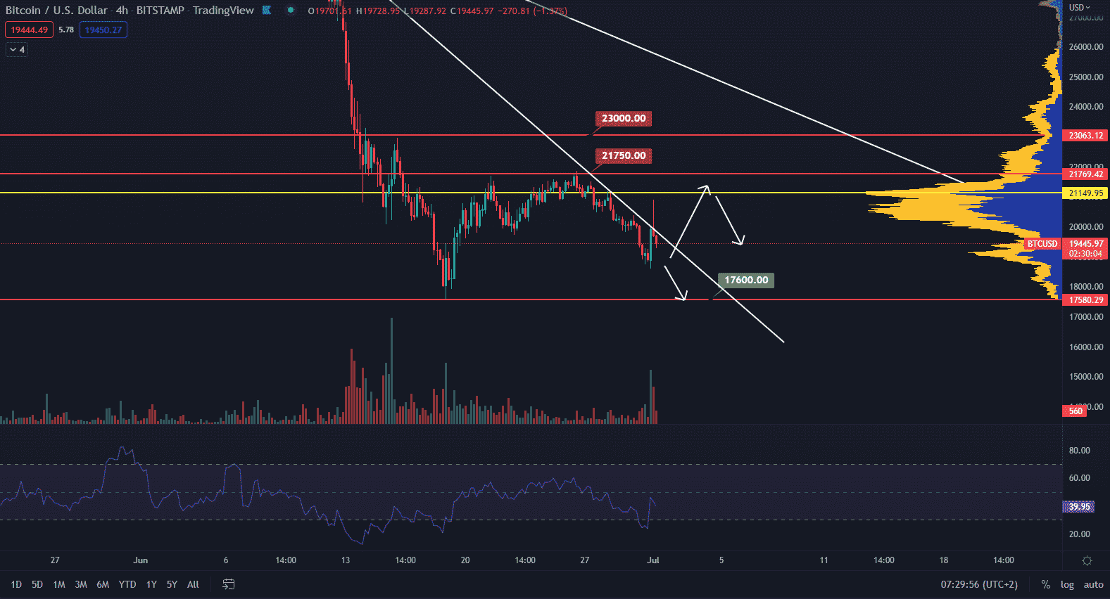 Na grafe nižšie môžete vidieť 2 scenáre, ktoré sú pravdepodobné na najbližšie dni. Prvý scenár hovorí o tom, že cena neprekoná ani najbližšiu rezistenciu, na ktorej posledný fake breakout zlyhal. V takom prípade budeme sledovať, či sa cene podarí vytvoriť minimum na hladine 17 600 $ alebo vyššie. Ak nie, korekcia bude pokračovať.
