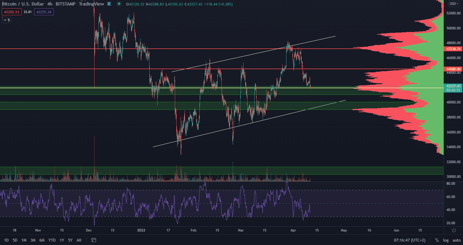 BTC je na prvej supportnej oblasti okolo 42 000 $. Okrem tejto supportnej zóny však budeme sledovať aj support okolo hladiny 40 000 $. Táto hodnota je reverzná a kľúčová počas celej sideway štruktúry Bitcoinu, ktorá trvá zhruba 16 mesiacov. Očakávam odraz od minima práve v tejto oblasti smerom nahor.