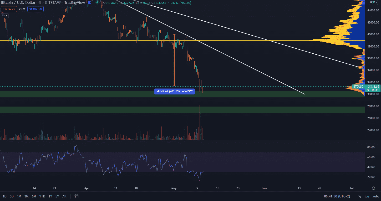 Prípadný pokles pod 30 000 $ by znamenal pre cenu hľadanie nového supportu. A popravde, ide o reálny scenár pokiaľ sa nezobudia býčie objemy. Odraz od 30 000 $ bol totižto tragický. V tomto scenári budeme sledovať 27 000 $. Celkovo však oblasť pod 30 000 $ možno považovať za dlhodobú nákupnú zónu.
