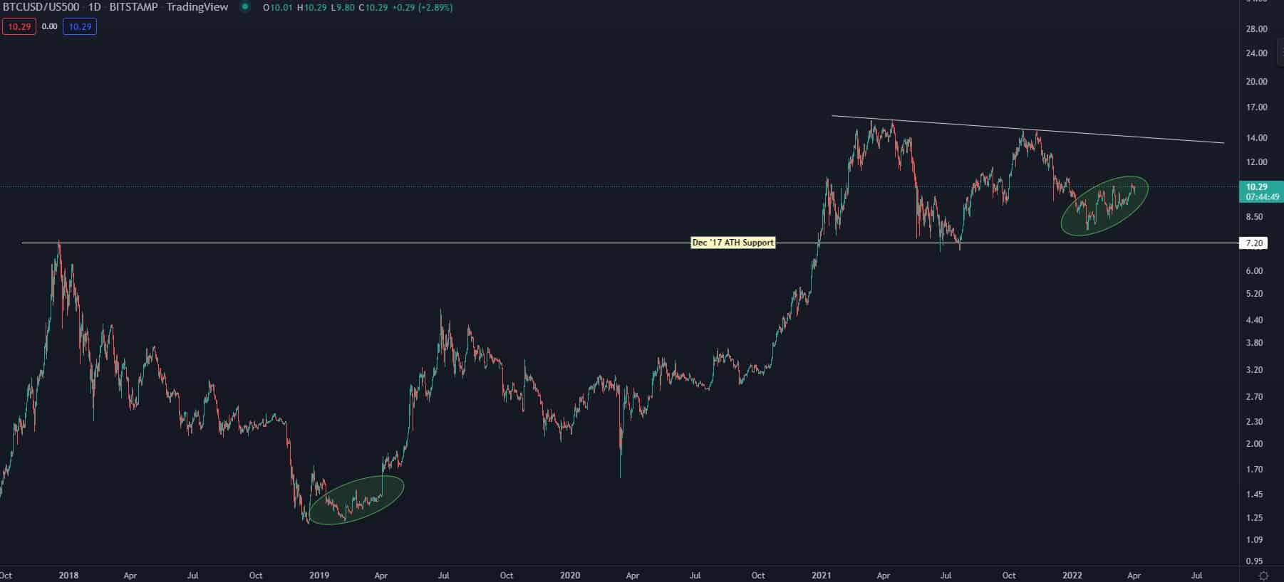 „Zaujímavým párom, ktorý treba sledovať, je BTC vs SPX. Graf je 10x čistejší ako BTC vs USD, ukazuje jasnú podporu v základnom pásme nad supportom z roku 2017 a oveľa silnejšiu makroštruktúru (žiadny falošný breakout/all-time high v októbri/novembri).”