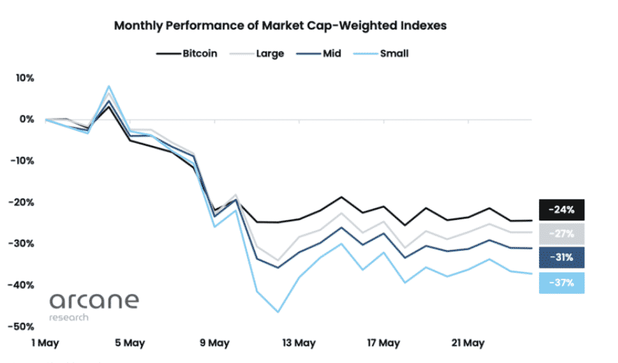 Za mesiac máj cena Bitcoinu klesla o 26 %, čo je obrovský pád. Ale indexy s malou, strednou a veľkou kapitalizáciou dopadli horšie. Index veľkej kapitalizácie klesol od začiatku mesiaca o 27 % a index strednej kapitalizácie klesol o 31 %. Index nízkej kapitalizácie zaznamenal najviac strát s 37 % poklesom od začiatku mesiaca.