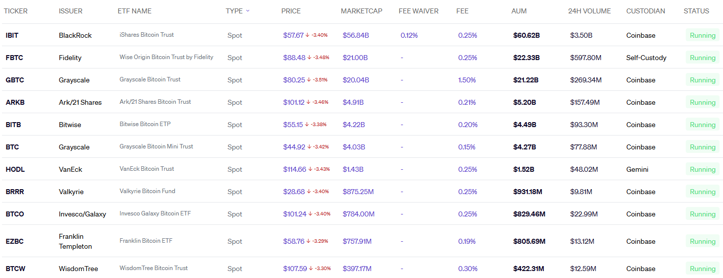 Zoznam amerických spotových ETF na Bitcoin môžete vidieť na obrázku nižšie na základe údajov Blockworks. Najväčším správcom je Blackrock, nasleduje Fidelity a Grayscale. Tento finančný nástroj existuje presne rok a za toto obdobie prilákal desiatky miliárd dolárov od investorov.