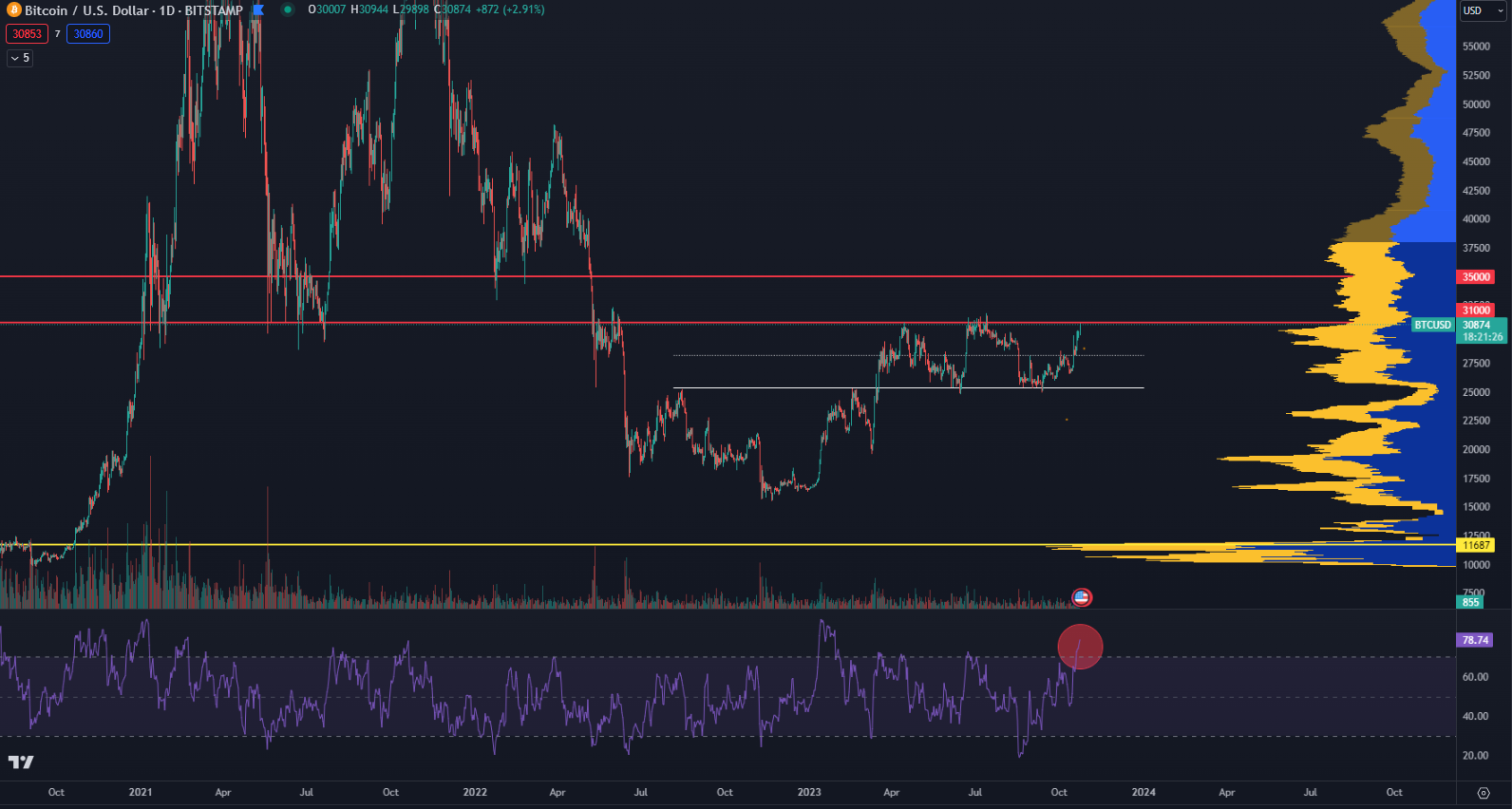 Bitcoin nedávno prekonal psychologickú hranicu 30 000 dolárov a v čase písania článku sa obchoduje na úrovni 30 874 dolárov na základe údajov TradingView. Cenový vzostup však čelí kľúčovej rezistencii, pri ktorej sa rozhodne, či sa definitívne skončí bočný pohyb trvajúci od marca 2023. Zároveň sa pozrieme na potenciálny cenový cieľ v prípade prierazu.