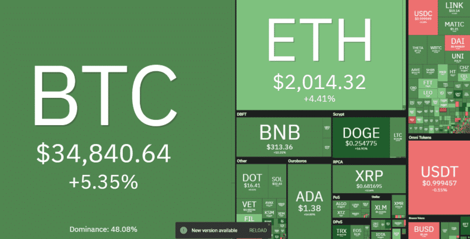 Bitcoin získal nový impulz, keď sa začala po webe šíriť správa o tom, že v Paraguajská vláda plánuje predložiť návrhy zákonov na prijatie Bitcoinu ako zákonného platidla. Po zverejnení týchto neoverených správ získal Bitcoin silu, čím sa mu podarilo vyšplhať až na úroveň 35 289 USD.