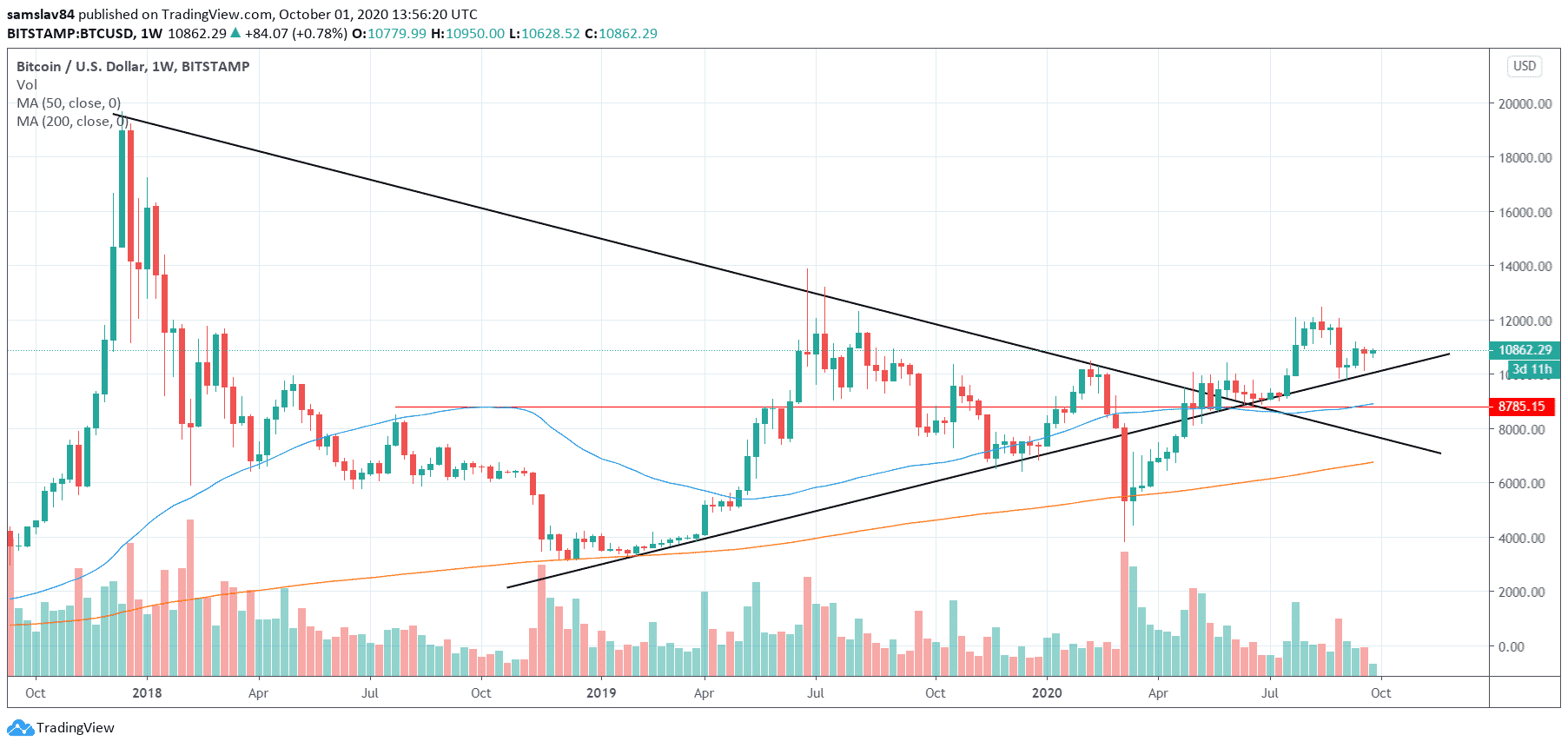 Dlhodobý downtrend skončil. Bitcoin sa v máji dostal nad klesajúcu trendline a po marcovom zaváhaní tak pokračuje v raste. Počas septembra sme opäť kvalitne otestovali rastúcu trendovú líniu, ktorá tlaku vydržala.
