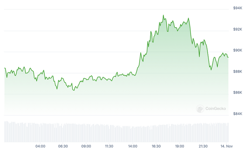 Údaje z Coingecko odhalili, že Bitcoin v stredu 13. novembra vystúpil až na 93 477 dolárov, čo znamená nové historické maximum pre toto aktívum. V čase správy Bitcoin klesol na 90 078 dolárov.