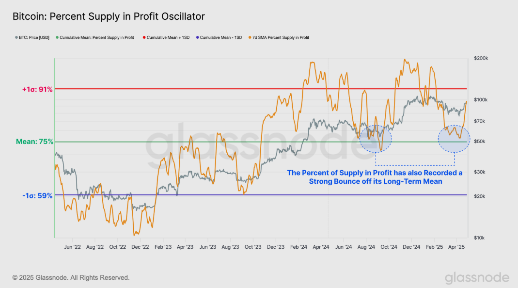 Ďalším významným ukazovateľom pri analýze resetov v rámci Bitcoinu je percento cirkulujúcej ponuky v zisku. Tento ukazovateľ sa pozerá na každú mincu jednoducho – je buď v zisku (aktuálna cena > nákupná cena), alebo v strate. Neberie pritom do úvahy veľkosť zisku či straty, ako je to pri MVRV.