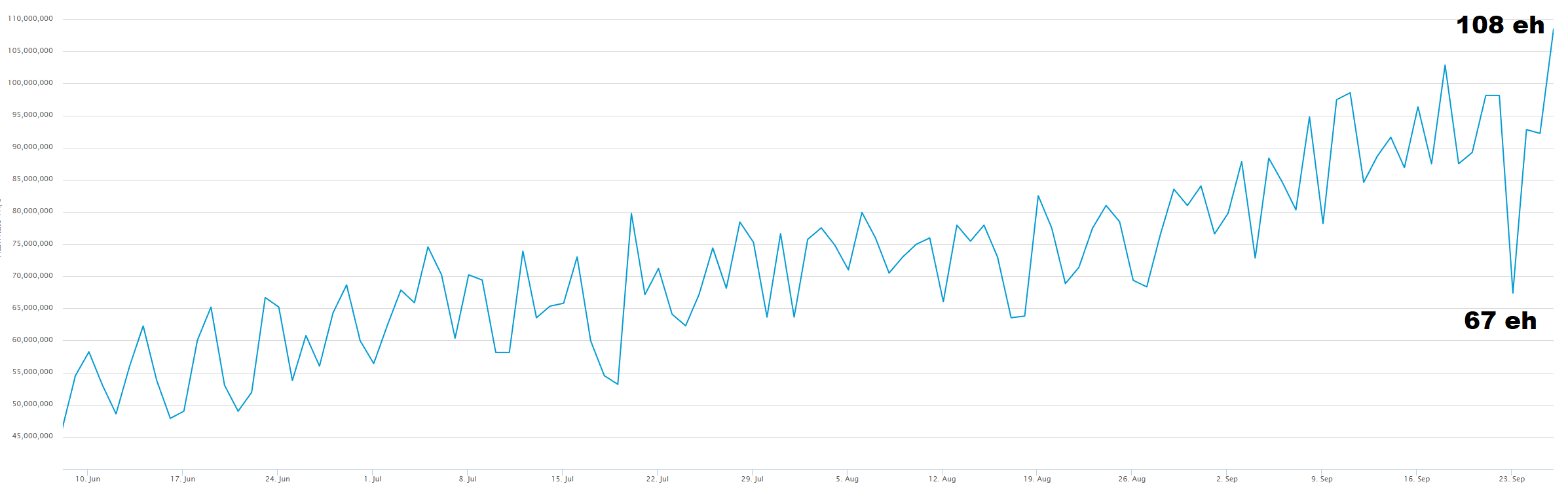 V pondelok sme vás informovali o podozrivom prepade hashratu Bitcoin siete, ktorý nasledoval dump celého trhu. Zdá sa však, že ťažiari Bitcoinu stále veria a hashrate už zase rastie. A nejde o žiadne drobné! Z pondelkových 58 exahashov – resp. priemernej hodnoty z toho dňa 68 exahashov – dnes poskočil na rekordných 118 exahashov! (priemer dňa 108 exahashov)